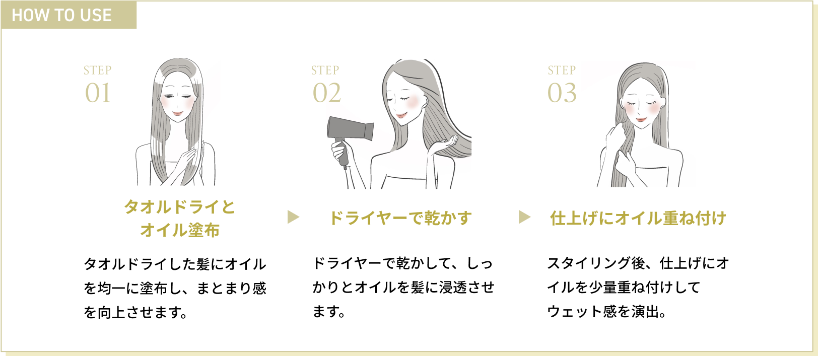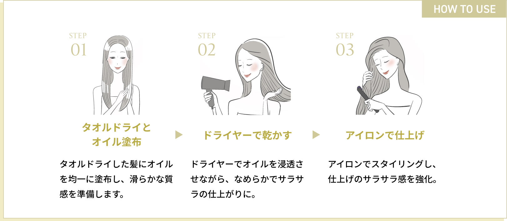 タオルドライした髪にオイルを均一に塗布し、滑らかな質感に整えます。ドライヤーでオイルを浸透させながら、なめらかでサラサラの仕上がりに。ヘアアイロンでスタイリングし、仕上げのサラサラ感をさらにアップさせます。
