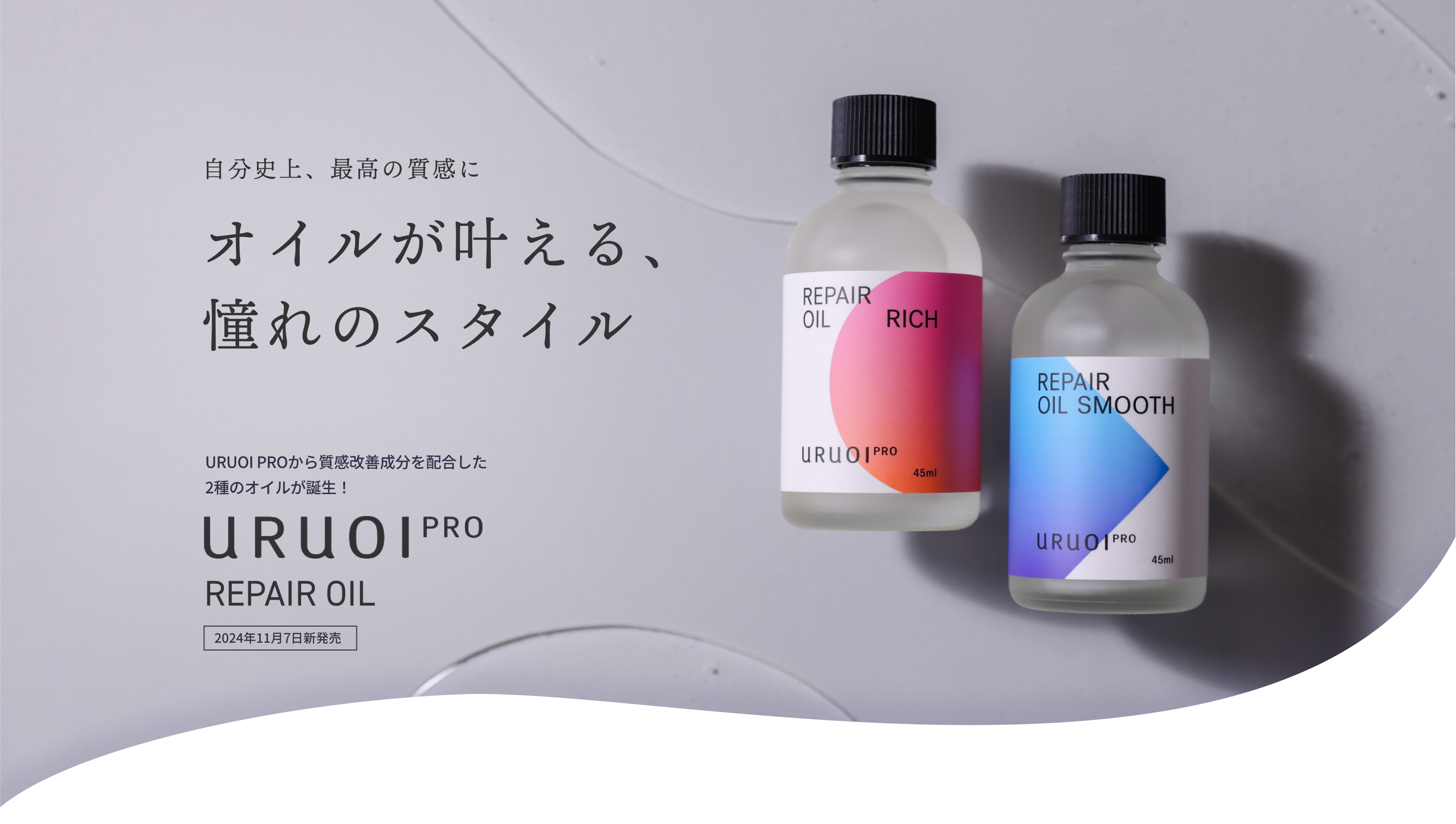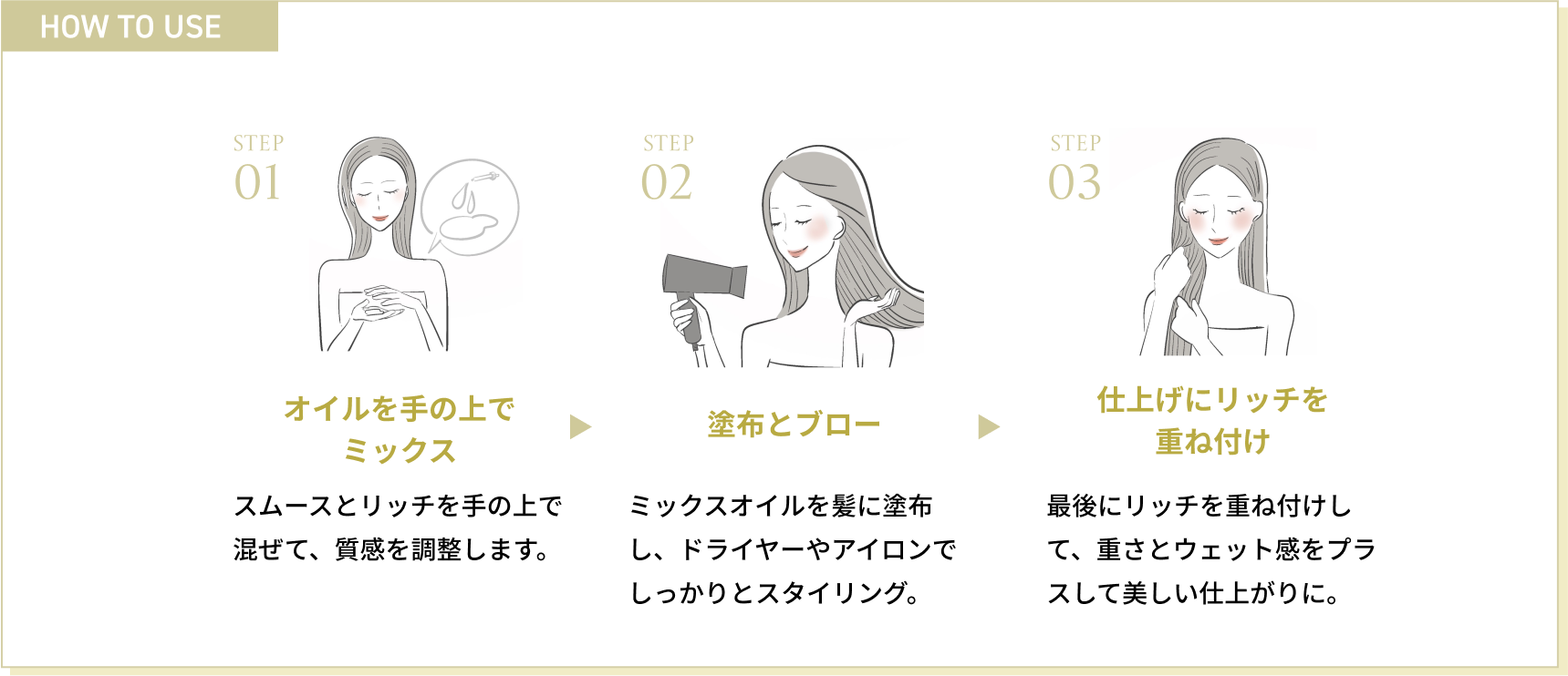 スムースをベースにリッチを数滴加えることで、軽さとウェット感を自由に調整可能。または、スムースでベースのスタイルを整えた後にリッチを重ね付けすることで、どんな髪質でも美しい仕上がりを実現します。